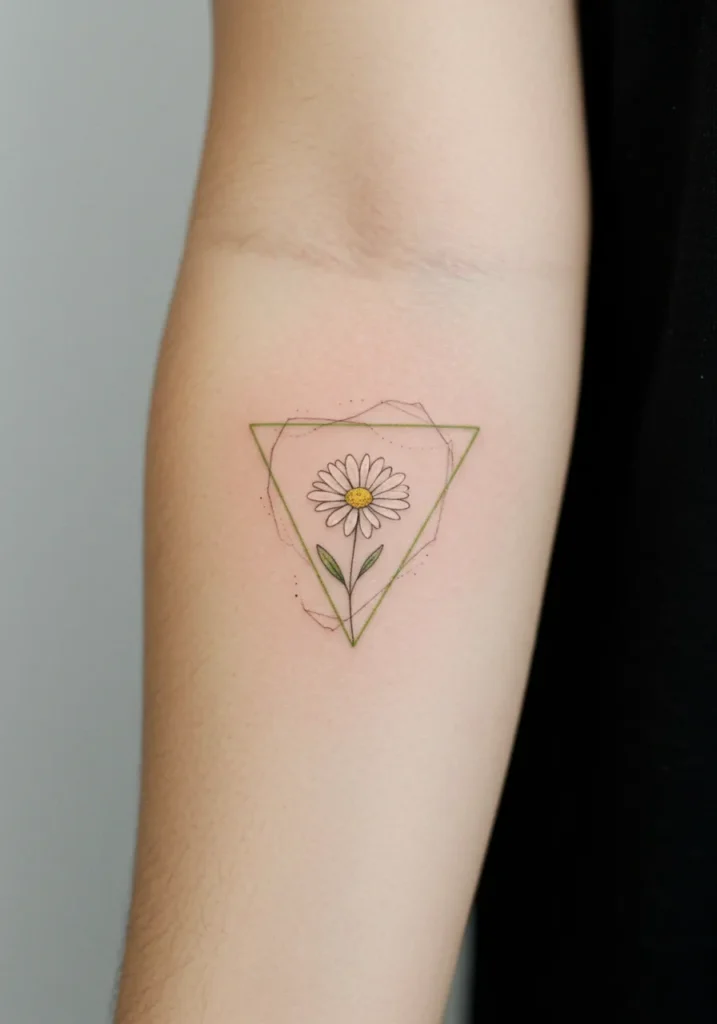 This tattoo features a single, delicate daisy encapsulated within a geometric triangular frame. The fine line technique emphasizes the minimalism of the design, with the sharp edges of the triangle contrasting beautifully with the soft, rounded petals of the flower. Subtle hints of color light yellow at the center and soft greens in the leaves bring a touch of vibrancy while maintaining the tattoo s simplistic charm. Tiny dotted lines and soft shading give the design an ethereal, almost dreamlike quality.