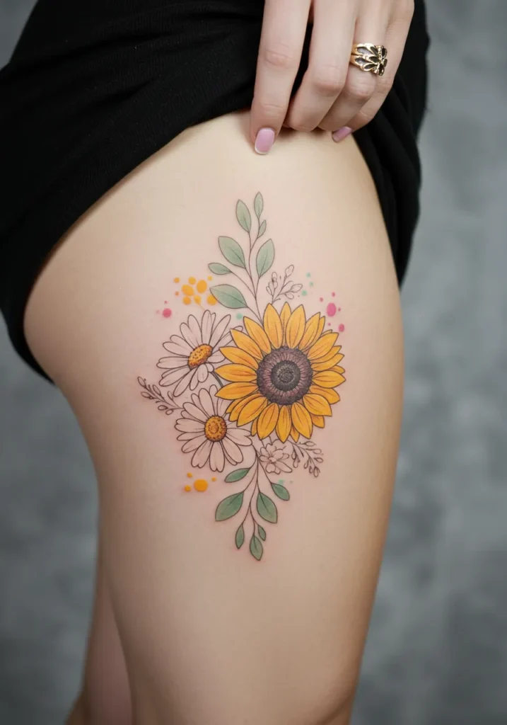 This tattoo features a beautiful sunflower and daisy arrangement, delicately inked with fine lines and soft colors. The sunflower, with its rich yellow petals and deep brown center, stands out next to the delicate white petals of the daisy, creating a striking contrast. Lush green leaves and soft orange dots add depth and life to the design. The placement on the thigh gives the tattoo a natural, organic flow, making it feel like a bouquet of happiness on the skin.