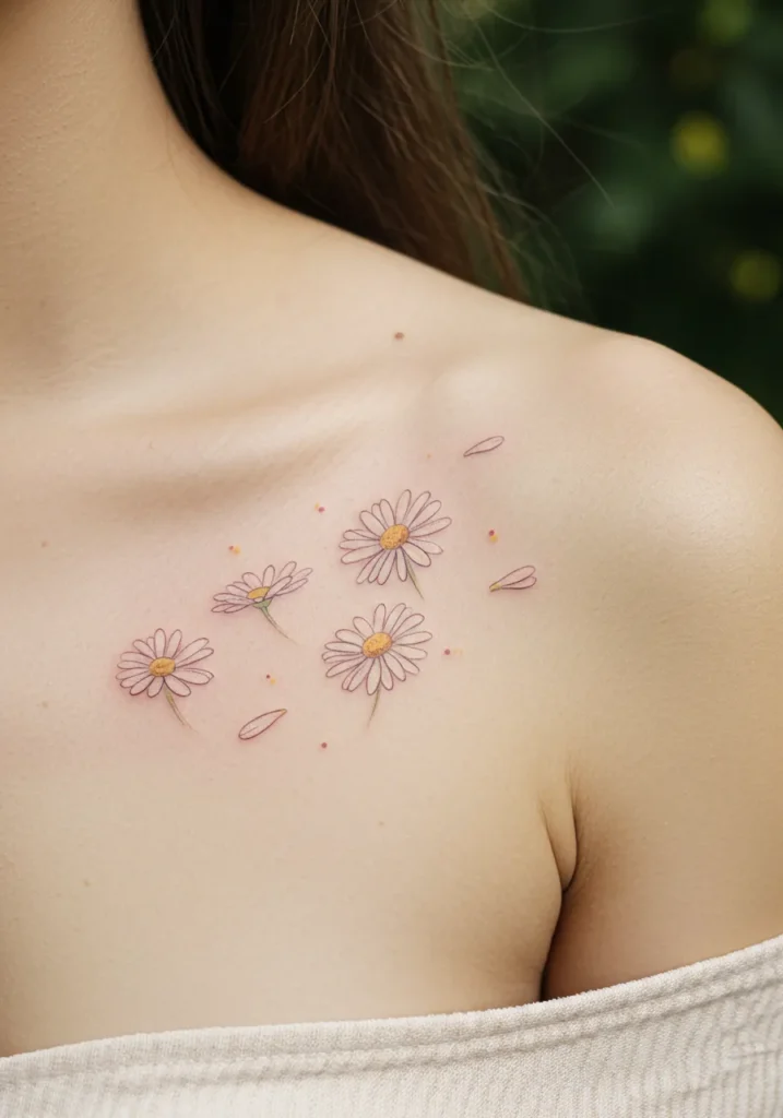 This dainty tattoo features a beautiful arrangement of fine line daisies, delicately inked on the collarbone area. The design is simple, yet captivating, with the flowers gracefully scattered, giving the impression that they are gently floating. Subtle splashes of color, including soft pinks and yellows, provide a playful contrast to the fine black outlines of the petals and stems, enhancing the fresh, spring-like vibe of the tattoo.
