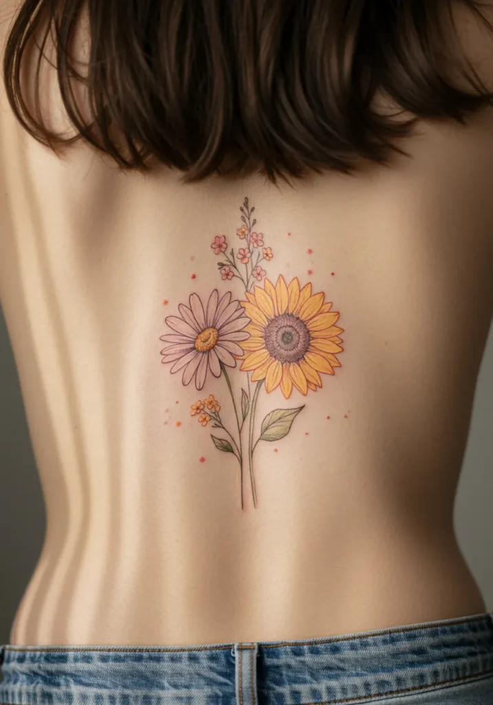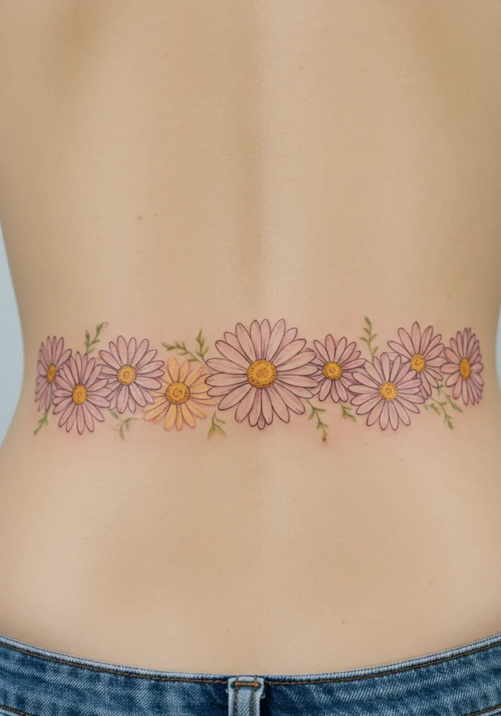 I absolutely love this tattoo. There s something about the way it softly hugs the curves of the lower back that s so flattering and feminine. The gentle use of color makes it feel fresh and delicate, and the fine line details really allow each daisy to shine. It s the kind of tattoo that feels both timeless and effortlessly beautiful. If you re someone who loves nature-inspired tattoos with a light, feminine touch, this one s just perfect!