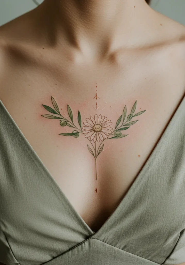 This stunning tattoo features a central daisy surrounded by delicate leaves and tiny dots, creating a soft, symmetrical design. The daisy s gentle yellow center and white petals are complemented by the earthy greens of the leaves, with fine lines forming a graceful, flowing composition that stretches beautifully across the chest. The design is simple yet captivating, offering an elegant and refined look.