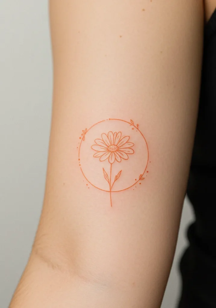 This tattoo features a single daisy placed delicately within a perfect circular frame, outlined with a soft orange hue. The fine line work adds a minimalist touch, highlighting the simple beauty of the daisy with subtle leaves extending from the stem. The fine dots and graceful curves surrounding the circle give the tattoo a refined and gentle aesthetic. The tattoo is small, yet its delicate lines make it feel elegant and impactful.