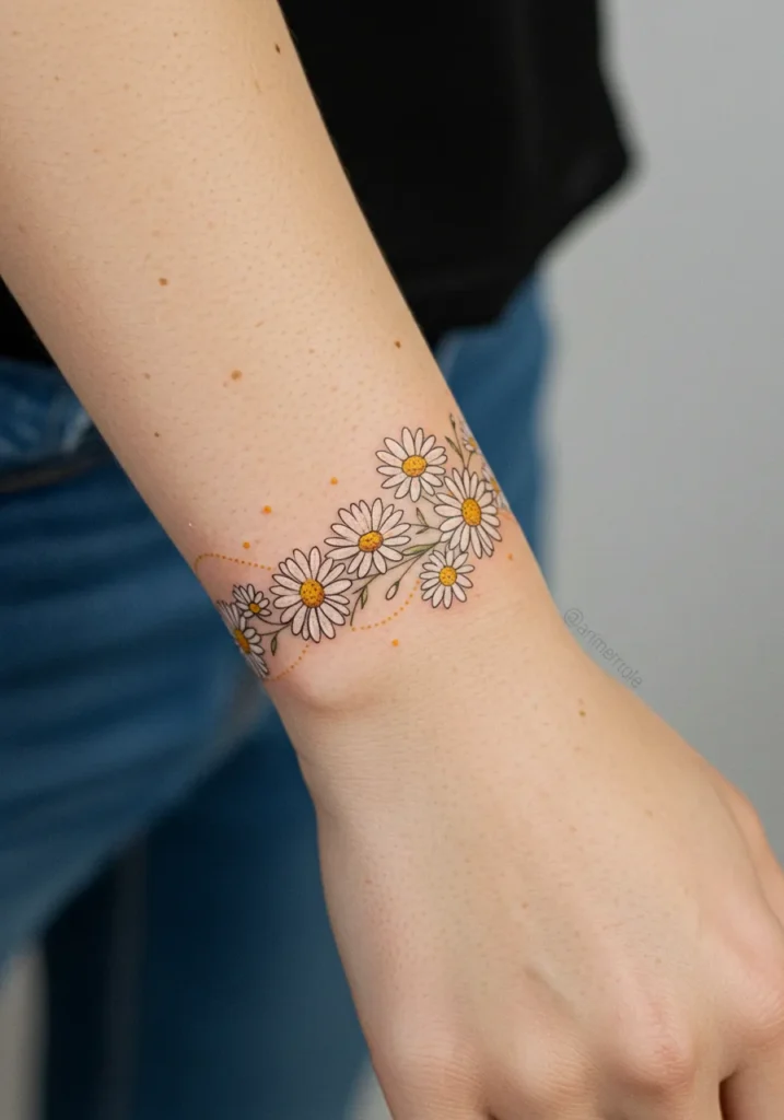 This tattoo is a beautiful and delicate design featuring a line of fine-line daisies wrapped around the wrist. The simple yet vibrant arrangement of white petals, yellow centers, and soft green stems creates a minimalistic look that feels fresh and modern. Subtle orange and pink dots surround the flowers, adding a soft pop of color without overpowering the simplicity of the design. It s a continuous loop of nature that feels gentle and effortless, making it the perfect addition to the wrist.