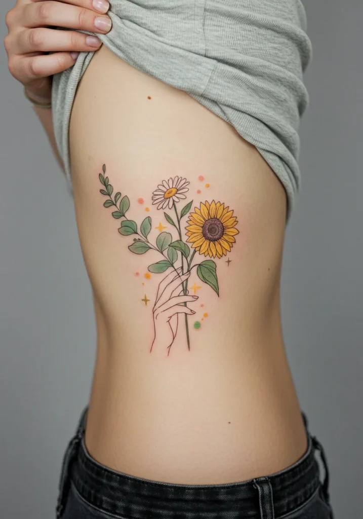 This tattoo features a hand gently holding a beautiful blend of daisies and a vibrant sunflower, framed by delicate leaves. The fine line work emphasizes the softness of the flowers and the hand, while the use of warm yellows and greens adds life and brightness to the design. Tiny orange and yellow dots surround the flowers, giving the tattoo a playful, sparkling touch. Placed on the side of the ribcage, this tattoo is both elegant and full of character, with a sense of movement and energy.