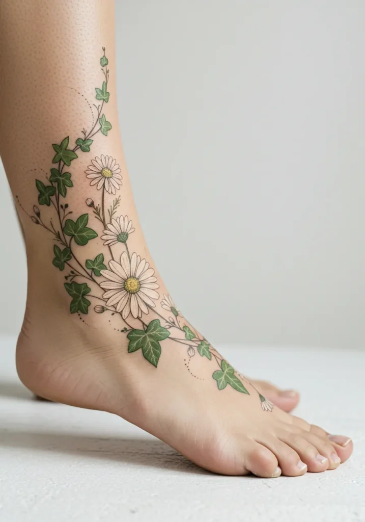 This beautiful tattoo elegantly wraps around the ankle, featuring a series of daisies intertwined with lush green ivy. The fine line detailing on the flowers and leaves adds a delicate touch, while the soft colors of the daisies pink petals with yellow centers complement the rich, deep green of the ivy. The design feels organic and flowing, as if nature itself has embraced the ankle in a subtle, graceful way.
