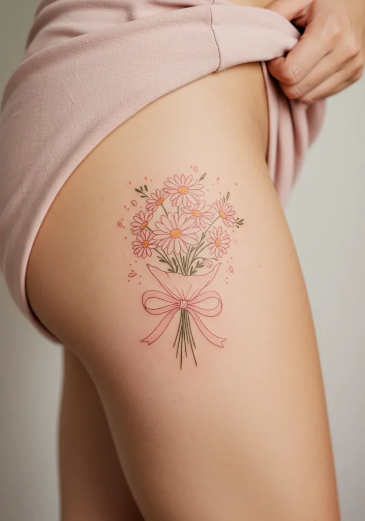 This lovely tattoo depicts a delicate bouquet of daisies wrapped in a soft ribbon. The fine line work is paired with soft, pastel colors, including pink petals and a hint of yellow in the flower centers. The stems are gracefully tied together with a bow, and a few subtle dots around the flowers add a playful touch. Positioned on the side of the thigh, this design feels light, fresh, and effortlessly feminine.