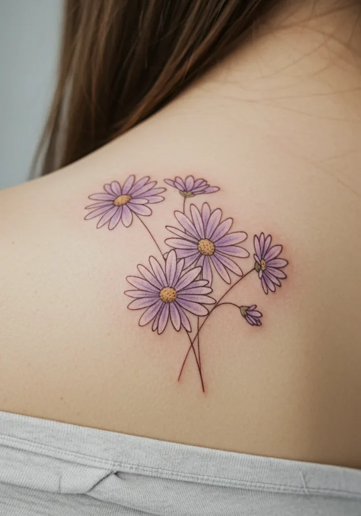 This minimalist tattoo showcases a delicate arrangement of purple daisies, each with finely detailed petals and a subtle yellow center. The fine line style highlights the beauty of simplicity, with thin, graceful stems and tiny leaves. A touch of light pinkish hues and soft shading around the flowers gives the tattoo a dreamy, almost ethereal quality. The overall design is clean and minimalist, yet full of life and character.