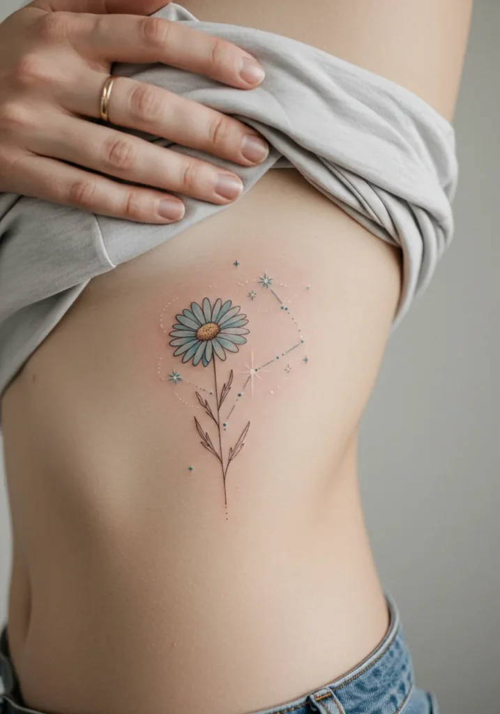 This gorgeous tattoo showcases a single daisy standing tall with a delicate stem, adorned by tiny stars that surround it in a celestial fashion. The daisy is done in soft shades of light blue and white, while the stars add a bit of sparkle in pastel pinks and blues. The fine line technique used for the flower and leaves gives it an elegant and airy feel, while the surrounding stars add a dreamy, ethereal vibe. The tattoo is placed beautifully on the side of the torso, emphasizing the delicate nature of the design.