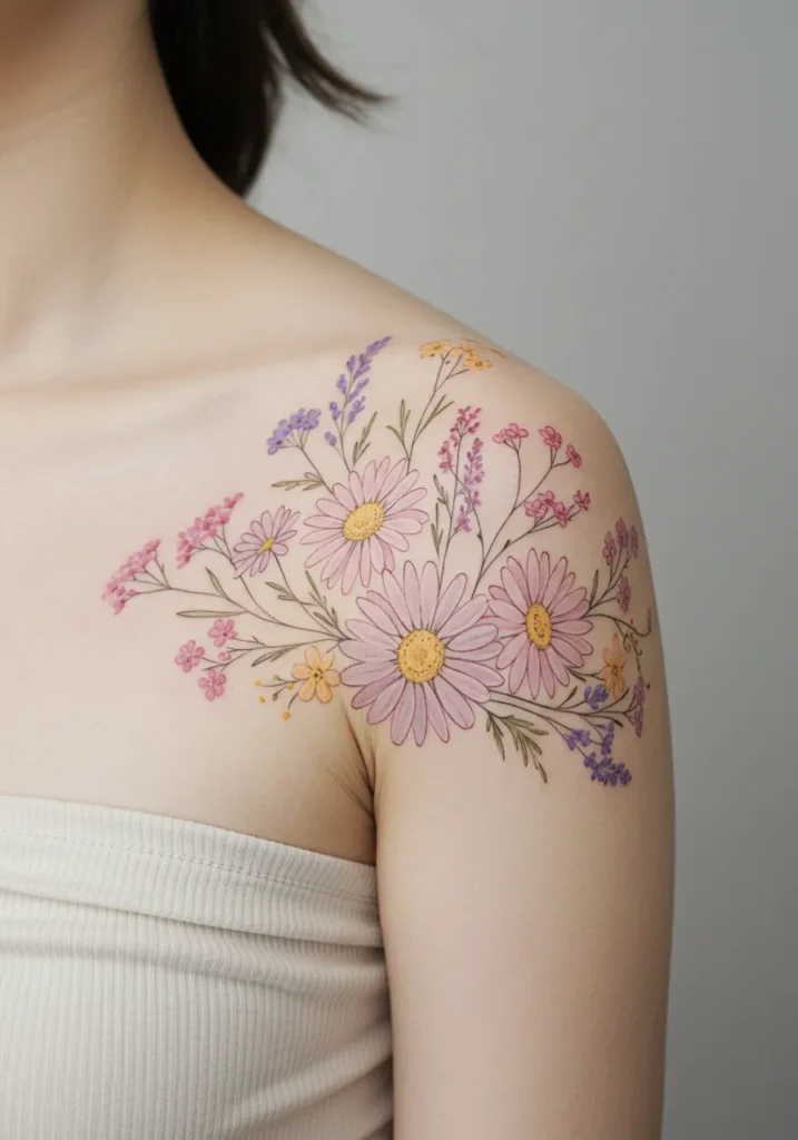 This gorgeous tattoo features a collection of vibrant daisies and other delicate wildflowers arranged across the shoulder. The fine line design adds a soft, feminine touch, with pastel pinks, purples, and yellows used to bring the flowers to life. The intricate stems and leaves flow seamlessly from the center, giving the tattoo a sense of movement and organic beauty. The natural colors and soft outlines create a fresh and youthful aesthetic.