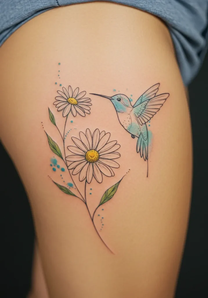 I absolutely adore this tattoo for its perfect blend of life and motion. The hummingbird s presence is so graceful and full of energy, while the daisies add a touch of calm and beauty. The watercolor effects around the flowers create a dreamy, almost ethereal vibe that makes this tattoo feel light and alive. The fine line work ensures it remains delicate, and the placement on the thigh gives it such an intimate, graceful feel. This tattoo is ideal for anyone who loves nature and wants a piece that s both beautiful and full of character.