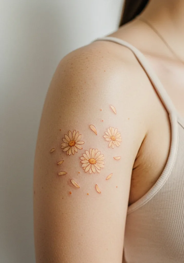 This tattoo features a few daisy flowers in a delicate fine line style, with soft pastel colors giving them a gentle, airy feel. The flowers appear to be floating as their petals seem to be gently falling away, creating a sense of movement and lightness. Tiny dots add a playful touch, further enhancing the ethereal nature of the design. The placement on the upper arm gives this tattoo a feminine, elegant look.