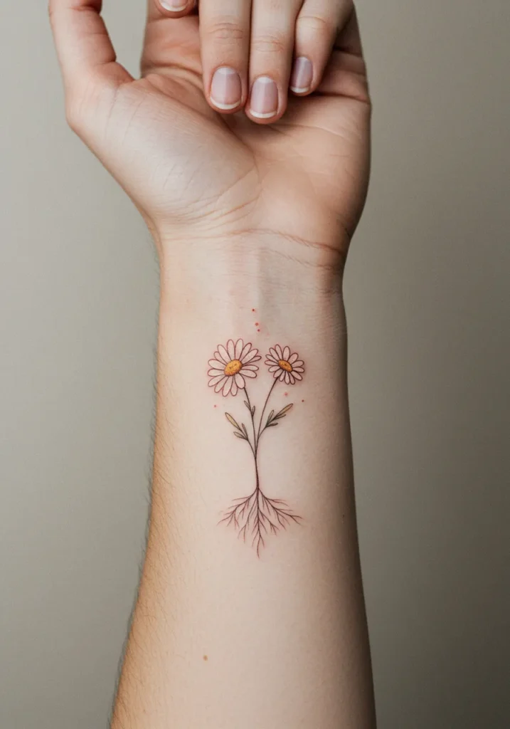 This tattoo features a pair of delicate daisies, beautifully inked in fine lines with soft pastel colors. The flowers stand tall on thin, graceful stems that gently branch out, with roots artistically emerging beneath them. A few subtle red dots add a playful and charming touch to this minimalist design. Positioned on the forearm, it offers a light, airy vibe that s perfect for those who prefer dainty, meaningful tattoos.