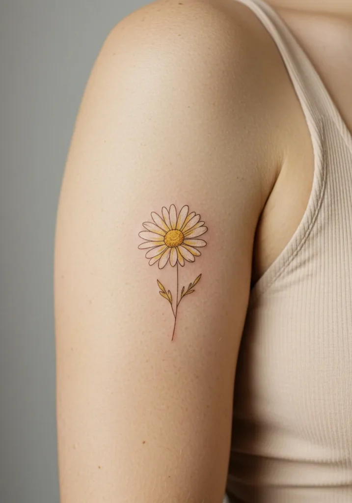 I think this tattoo is so sweet and perfectly simple. There s something incredibly elegant about a single daisy, and the fine line technique makes it feel fresh and airy. Plus, the placement on the shoulder just adds a soft and feminine touch. If you re after a design that s beautiful without being too bold or overpowering, this daisy tattoo is just what you need.