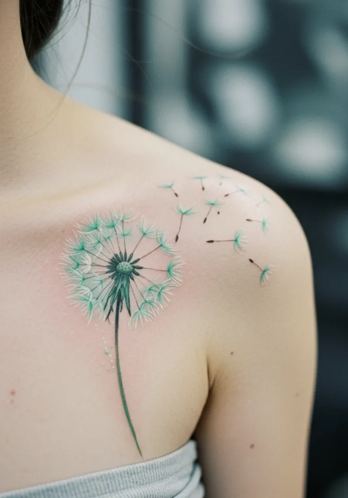 This fine line shoulder tattoo captures the soft whimsy of a dandelion in motion. The stem is long and delicate, while the fluffy seeds are shaded in pale mint green with tiny details that make them look like they re floating right off the skin. Some of the seeds trail off gently across the shoulder, giving the whole design a breezy, weightless feel that s both playful and poetic.