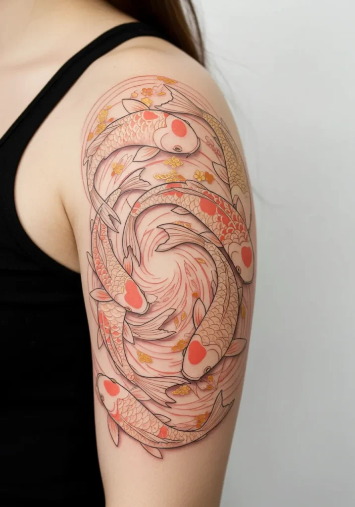 This fine line shoulder tattoo is a full-on art piece, with a mesmerizing spiral of koi fish swimming in motion. Each koi is shaded in soft creams and coral orange with golden accents that make everything feel a little more magical. The swirling water pattern in the background creates a beautiful sense of movement without being too chaotic. It s big, it s bold, and still somehow feels really graceful.