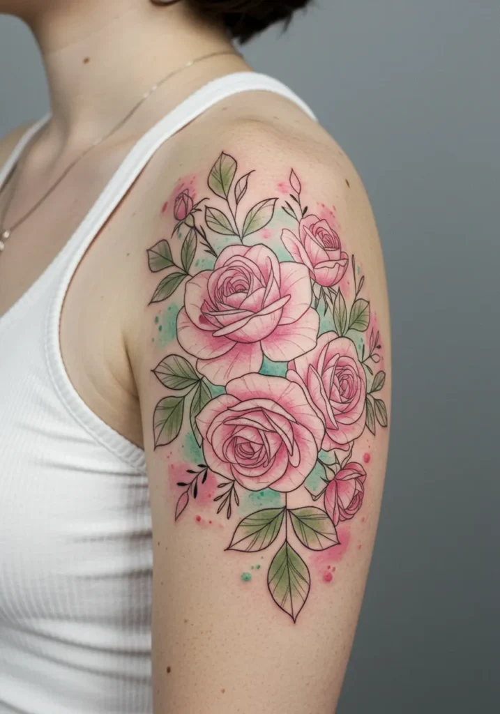 This fine line shoulder tattoo is a blooming bouquet of soft pink roses, delicately layered with leafy green accents and dreamy watercolor splashes in pastel pink and aqua. Each rose is drawn with crisp outlines and shaded petals that feel full of life. The leaves add contrast without overpowering the floral focus, and the little dots and soft brushstroke textures give it that perfect artistic flair.
