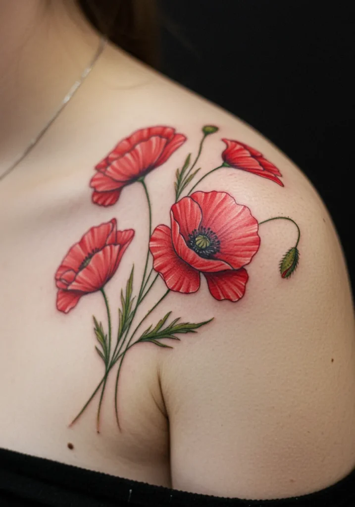 This fine line shoulder tattoo shows off a vivid cluster of red poppies blooming across the skin like a little garden in full sunshine. The petals are detailed with gentle shading in fiery reds and coral pinks, while the stems and leaves stay soft and graceful with earthy green tones. Each flower leans a different way, giving the whole piece movement and life without it feeling too busy.