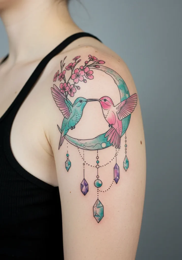 This dreamy fine line shoulder tattoo features two delicate hummingbirds perched on a crescent moon, beak to beak like they re sharing a little secret. The moon cradles a small branch of cherry blossoms above, while crystal-like charms hang below it like a dainty dreamcatcher. The color palette is pure magic, with soft gradients of teal, rose pink, and amethyst purple that give the entire design an ethereal glow.