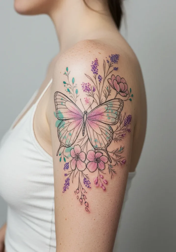 This fine line shoulder tattoo features a stunning butterfly at the center, surrounded by delicate floral sprigs in soft pastel pinks, purples, and teals. The butterfly wings are filled with a gentle wash of watercolor shading, giving the whole piece a light and airy feel. The fine outlines keep everything crisp, but the colors make it bloom with softness and femininity. It stretches beautifully along the shoulder, almost like it s in motion.
