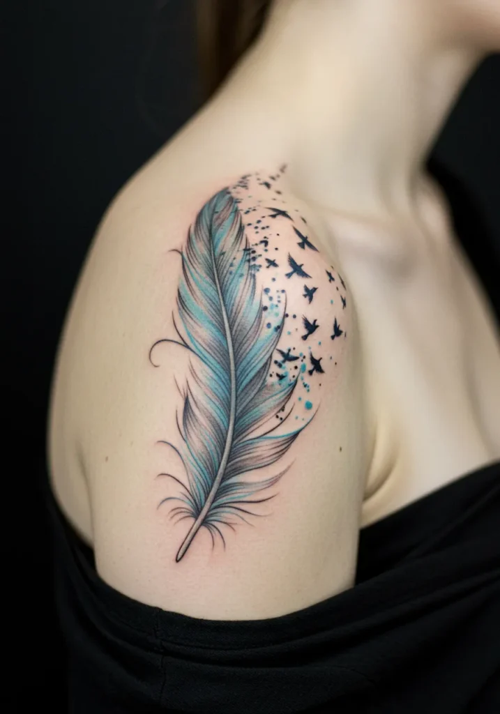 This fine line shoulder tattoo blends softness and freedom into one beautiful design. It starts with a graceful feather shaded in subtle turquoise and charcoal tones, and then seamlessly transforms into a flurry of tiny birds flying upward and outward across the shoulder. Little dots and splashes of teal add a dreamy, magical touch that makes the whole piece feel like it s lifting off the skin.