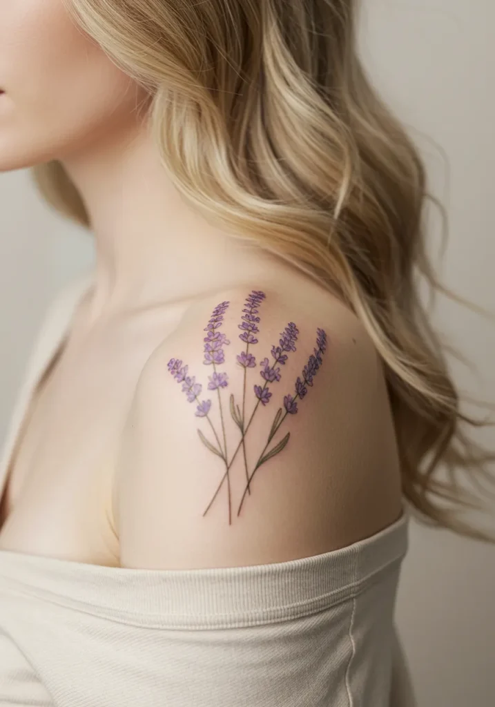 This delicate shoulder tattoo features a dainty cluster of lavender stems, each drawn with whisper-thin lines and soft purple blooms that feel like they were picked straight from a summer field. The sprigs are spaced just enough to give a breezy, airy feel, while the color stays light and natural, making the whole design incredibly calming and elegant.