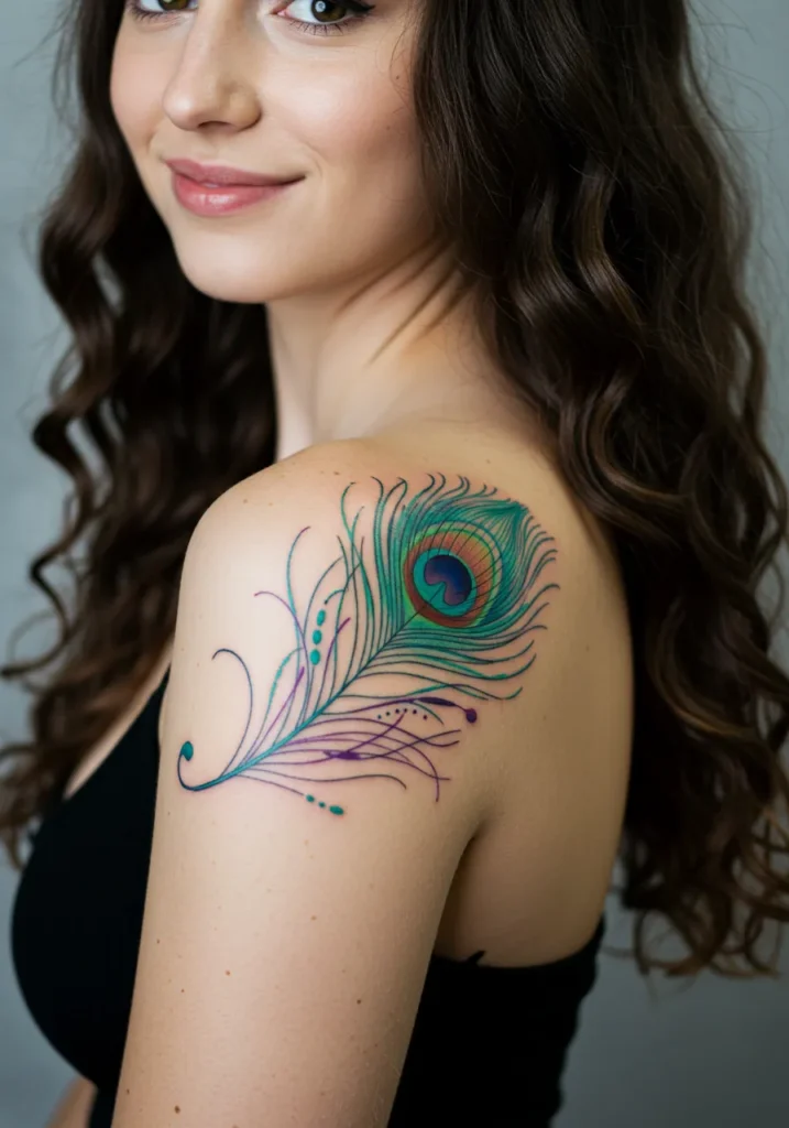 This fine line shoulder tattoo is an absolute showstopper. It features a single peacock feather that flows gracefully over the curve of the shoulder. The lines are clean and light, but the color really brings it to life. Teal, emerald, and violet blend beautifully into each strand, while the deep blue and warm amber tones at the center add a little drama in the best way.