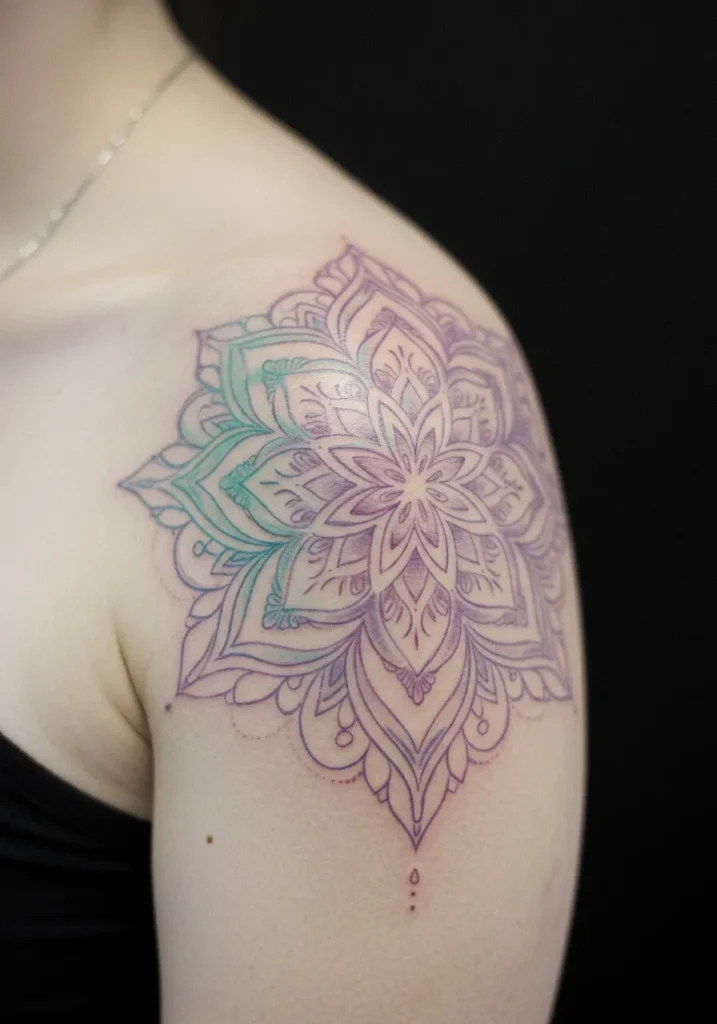 This fine line shoulder tattoo features a stunning mandala that blossoms outward in soft purples and hints of teal. The symmetry is incredibly detailed, with each petal unfolding into the next like a lace pattern etched in ink. The design hugs the curve of the shoulder so naturally, and the slight ombré shading adds a peaceful, almost glowing effect without being too bold.