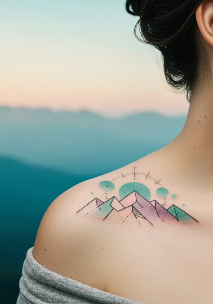 This fine line shoulder tattoo turns a classic mountain scene into something super modern and artsy. The mountains are built from sharp geometric lines, filled in with soft gradients of lavender, mint green, and pastel teal. Above them, a dreamy sun and floating dots complete the vibe, giving it that peaceful but slightly cosmic feel. Everything is clean and crisp, but there s so much personality packed into it.