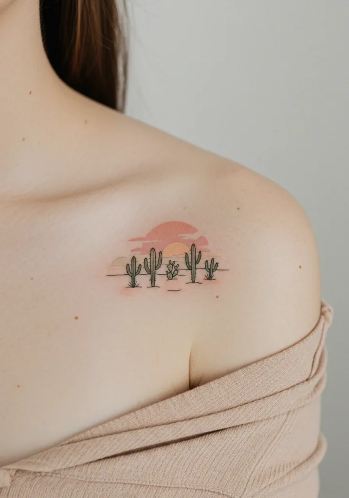 This fine line shoulder tattoo features an enchanting desert landscape complete with soft, pastel-colored cacti and a calming sunset backdrop. The delicate hues of blush pink, muted greens, and warm peach blend beautifully, capturing a serene desert vibe perfectly. Its minimalistic style paired with subtle watercolor shading makes it effortlessly chic and feminine.