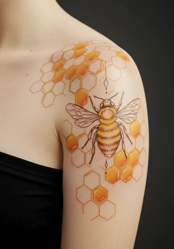Honeybee and Honeycomb Shoulder Tattoo