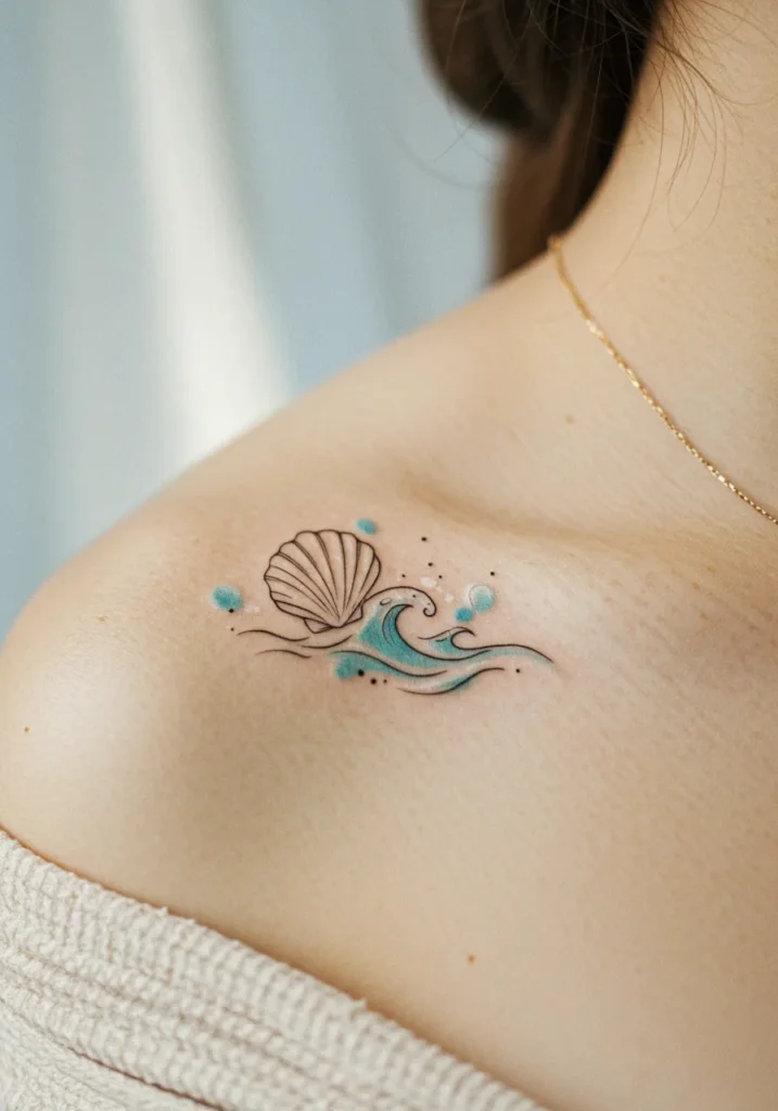This cute fine line tattoo brings a splash of the sea right to the shoulder. It features a delicate seashell perched above soft teal waves, all outlined with thin, precise lines that keep it light and airy. The waves swirl with gentle movement, and tiny bubbles and dots dance around the scene, making it feel like it s alive with ocean breeze.