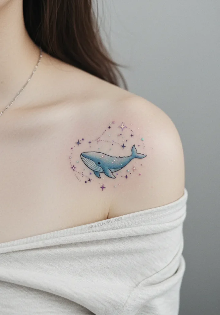 This fine line shoulder tattoo features an adorable blue whale swimming through a dreamy night sky filled with tiny stars, pastel dots, and constellations. The whale itself has soft gradient shading in ocean blue, with gentle white lines along the belly and a little sparkle in its eye. Around it, the constellation-style stars glow in purples and pinks, creating a magical little universe right on the shoulder.