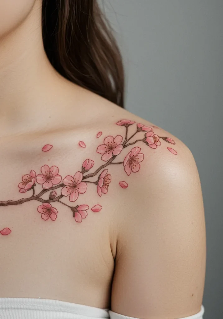 This fine line shoulder tattoo captures the delicate beauty of a blooming cherry blossom branch. The soft pink petals float naturally along the shoulder and collarbone, some still clinging to the branch while others drift gently as if caught in a breeze. The shading is subtle and romantic, with each flower outlined in a way that keeps the whole design light and airy.