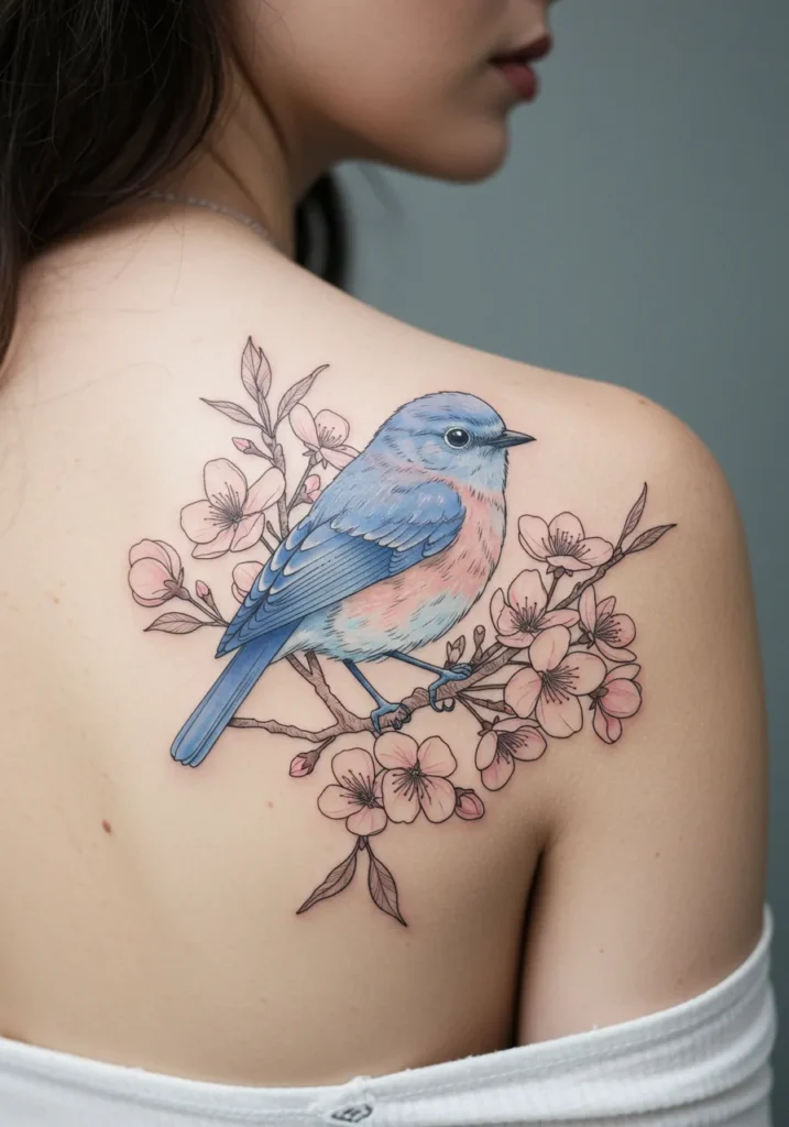 This fine line shoulder tattoo features the sweetest little bluebird perched delicately on a cherry blossom branch. The soft pastel blues and blush pinks blend beautifully with the crisp black outlines, giving it a dreamy, watercolor-like effect without losing the fine detail. The feathers are lightly textured, and the flowers add the perfect touch of softness to balance the overall design.