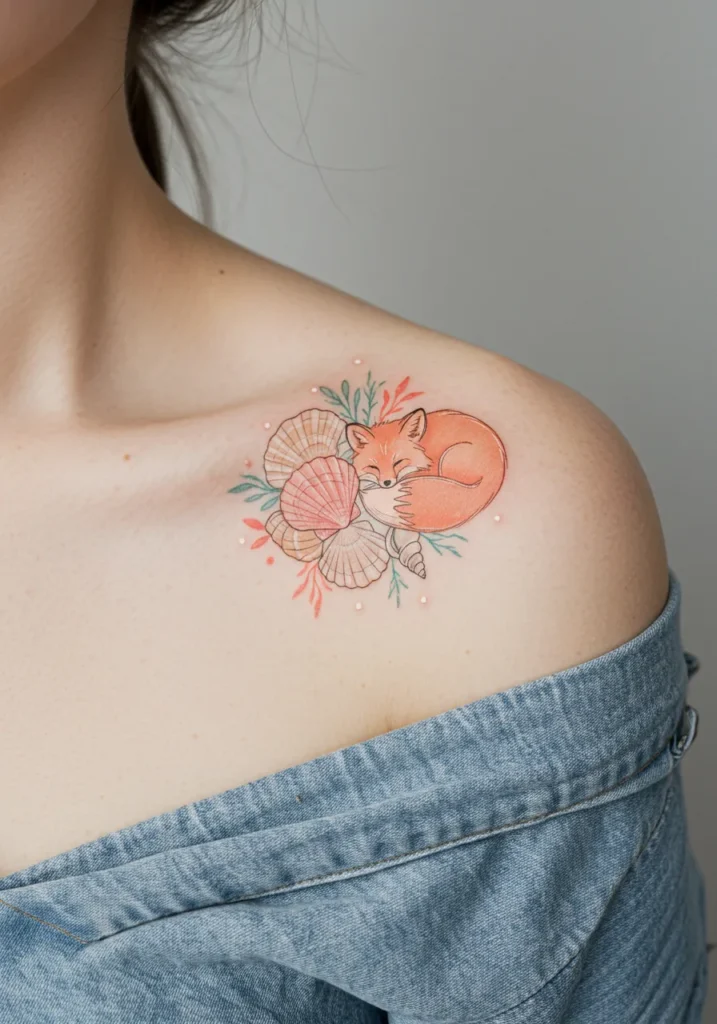This fine line shoulder tattoo is pure cozy cuteness. It features a tiny curled-up fox snoozing peacefully on a little bed of pastel seashells, coral sprigs, and soft green leaves. The warm orange of the fox stands out beautifully against the neutral shells, and the whole design has a gentle, dreamy vibe. Every detail feels delicate but intentional, from the shell lines to the blushing pink dots scattered around the edges.