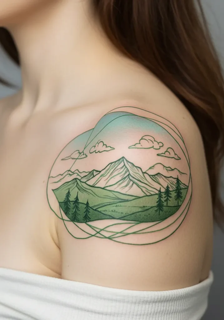 This fine line shoulder tattoo is a peaceful little escape etched into skin. It features rolling hills, tall pine trees, and a stunning mountain range, all framed by a soft sky with fluffy clouds and dreamy green shading. The whole design is enclosed in a swirl of clean overlapping lines, giving it this modern, artsy frame that makes everything pop. The colors are earthy but soft, and the details are just the right amount enough to pull you in without feeling heavy.