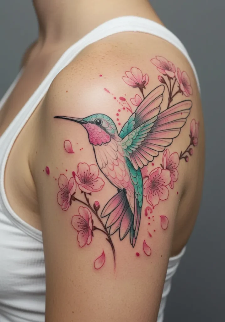 This tattoo features a stunning hummingbird in motion, captured mid-flight among delicate cherry blossoms. The fine linework outlines every tiny feather with precision, while the soft pastel blend of teal, pink, and lavender gives it an ethereal, watercolor-like effect. The blossoms frame the bird beautifully, creating a sense of movement and grace as petals seem to drift down the shoulder in a natural flow.