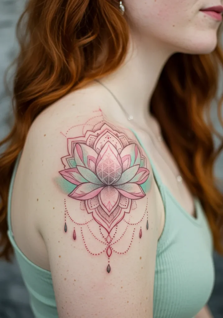 This fine line shoulder tattoo features a radiant lotus flower layered with intricate petal shapes and dreamy shades of blush pink and soft mint green. The shading is so delicate it almost feels like it s glowing from within. Surrounding the lotus are subtle dotted elements and tiny jewel-like drops, creating the illusion of a henna-inspired chandelier flowing down the arm.