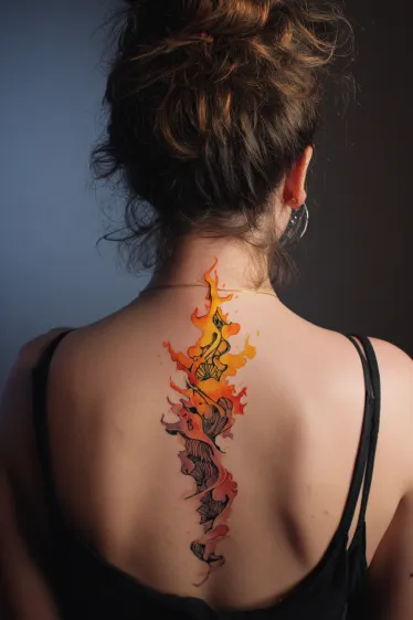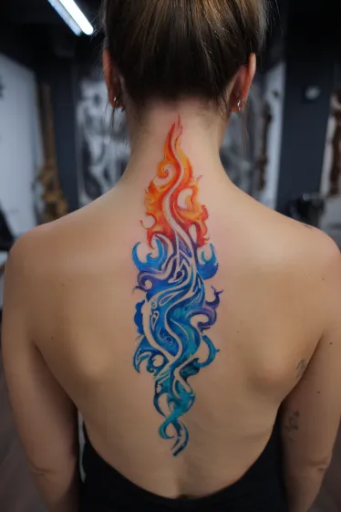 This tattoo features a vibrant flame design flowing down the spine, blending fiery reds and oranges at the top into cool blues and purples at the bottom. The flame is drawn with fluid, abstract shapes that create a sense of movement, almost like it s dancing on the skin. The watercolor shading gives it a soft, painterly look that makes the colors pop beautifully.
