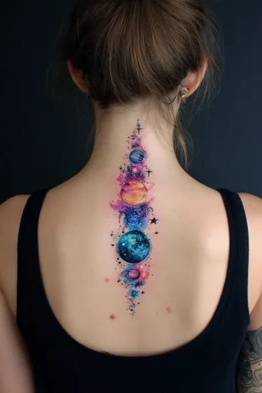 This tattoo features a stunning lineup of planets running vertically along the spine, surrounded by tiny stars and cosmic dust. The planets are shaded in vibrant colors, with deep blues, fiery oranges, and purples that make each one stand out. The watercolor-like background creates a dreamy space effect, turning the spine into a glowing pathway through the universe.