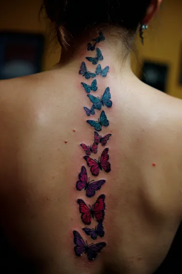 This tattoo features a graceful trail of butterflies starting small at the top of the neck and growing larger as they move down the spine. Each butterfly is shaded in rich hues of purple, pink, and blue, giving the design a lively and colorful appearance. The arrangement creates a sense of motion, almost like the butterflies are fluttering upward along the back.