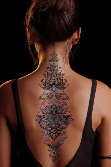 This tattoo features an intricate mandala design layered with geometric shapes that flow gracefully along the spine. The patterns are detailed and symmetrical, with diamond and triangle elements framing floral motifs. Subtle hints of color highlight the shapes, giving the tattoo a luminous effect while keeping its elegant balance. The vertical placement makes it appear almost like a sacred ornament running down the back.