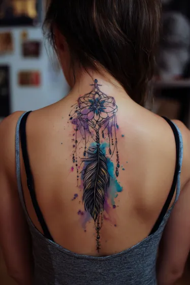 This tattoo combines a dreamcatcher design at the top of the spine with a long feather extending downward. The dreamcatcher is detailed with fine lines and beads, while watercolor splashes in purples, blues, and pinks add a playful and artistic touch. The feather below is bold and shaded, creating a strong vertical flow that makes the tattoo look balanced and elegant.
