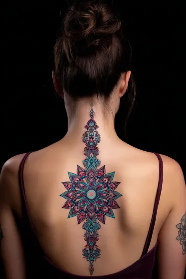 This tattoo features a beautifully detailed mandala design stretching along the spine with intricate symmetry and bold color. Shades of teal, pink, and purple blend together to highlight the layers of petals and geometric shapes. The placement flows perfectly down the back, creating a sense of balance and harmony that feels almost ornamental, like wearing permanent jewelry.