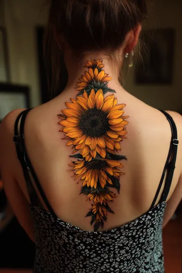 I adore this tattoo because it feels so cheerful and uplifting. Sunflowers always remind me of warmth and positivity, and having them arranged down the spine feels like carrying sunshine everywhere you go. It s a design that makes a statement while still radiating pure joy, and I think it s such a gorgeous way to blend beauty with meaning.