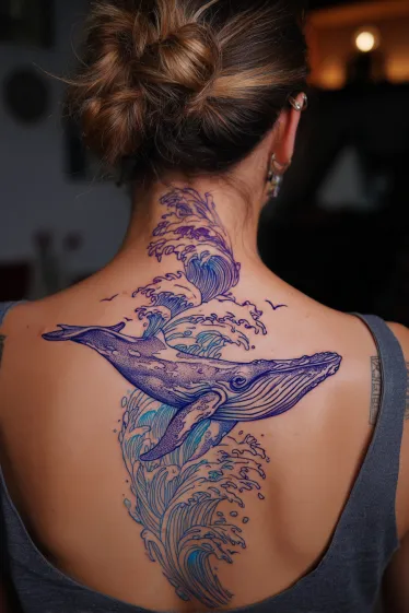 This tattoo stretches across the upper back with a majestic whale gliding through swirling waves that cascade down the spine. The design uses bold blue and purple tones that highlight the whale s details while giving the waves a sense of motion and energy. The vertical flow of water blends seamlessly with the natural line of the spine, making the whole piece feel fluid and alive.