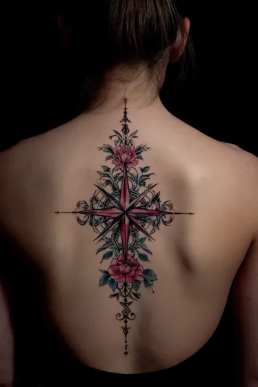 I love this tattoo because it feels powerful yet romantic. The compass brings a sense of direction and strength, while the roses add beauty and softness. To me, it s such a striking mix of bold and feminine, and the way it s centered on the spine makes it look like a true statement piece that s impossible to ignore.
