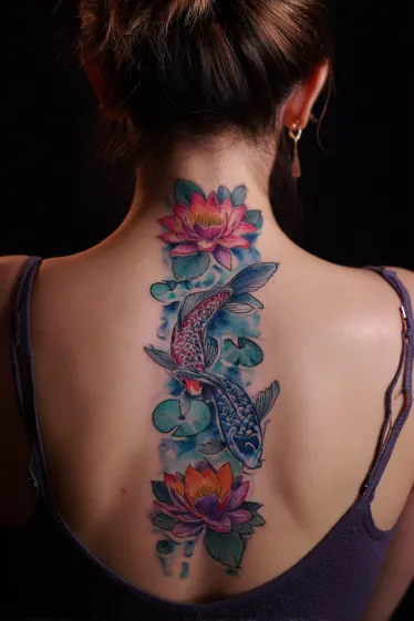 This tattoo flows beautifully along the spine with two koi fish swimming gracefully among lotus flowers. The koi are detailed with shimmering scales in deep blues and reds, while the lotus blossoms burst with pink and orange hues, framed by soft green lily pads. The vertical composition makes it look almost like a living painting that tells a story of balance and resilience.