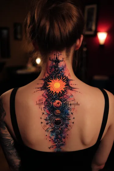 I think this tattoo is absolutely mesmerizing because it feels both artistic and meaningful. There s something magical about carrying an entire galaxy on your back, and the bright sun at the top feels like a source of energy radiating through the design. For me, it captures a sense of wonder and curiosity, and I love how it turns a simple spine tattoo into a powerful statement piece.