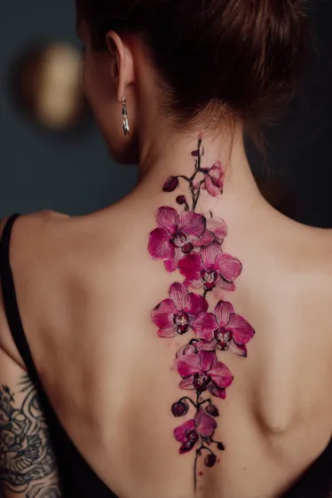 This tattoo features a graceful line of orchids cascading down the spine in shades of deep pink and purple. The flowers are drawn with fine detail, from the delicate veins in the petals to the soft shadows that give them depth. Each blossom flows into the next, creating a natural vertical arrangement that feels both elegant and eye-catching.
